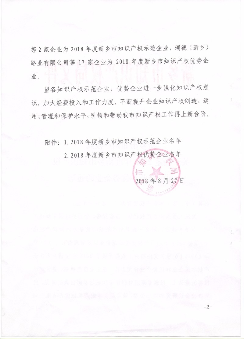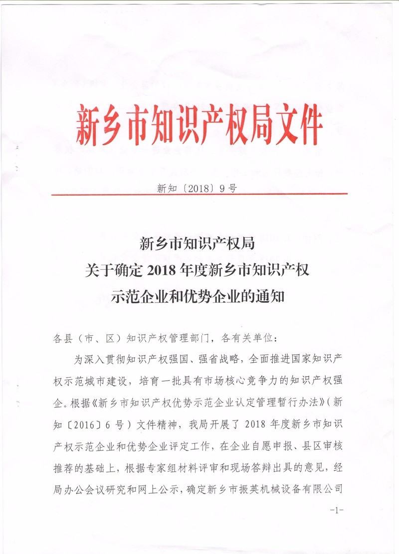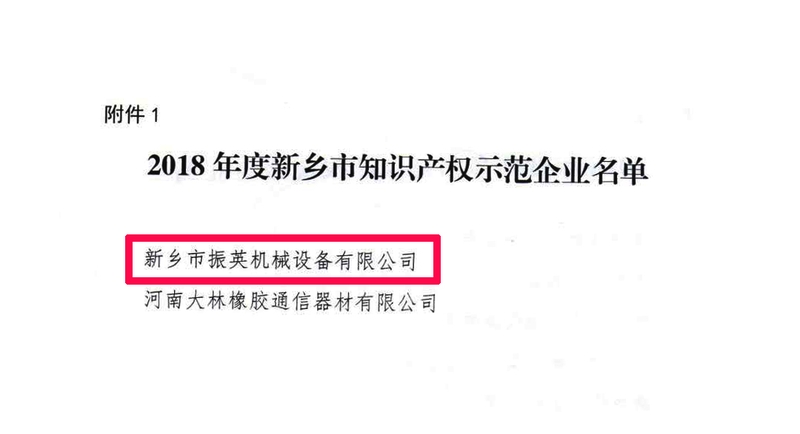 熱烈祝賀:新鄉(xiāng)市振英機(jī)械設(shè)備有限公司獲得2018年度新鄉(xiāng)市知識產(chǎn)權(quán)示范企業(yè)